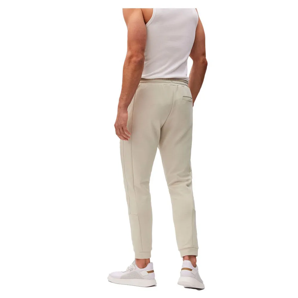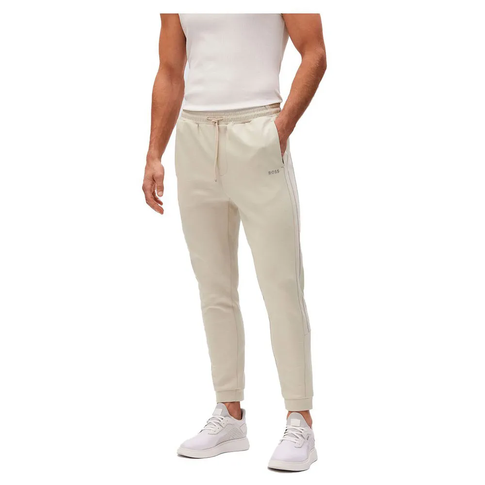 Tracksuit bottoms by BOSS Menswear, designed with a regular fit and cuffed hems. Created in double-faced cotton jersey with accents of tonal fabric in a piqué structure, this sporty pair features an elasticated waistband with a dipped-end drawcord for an adjustable fit. A curved logo in a layered effect delivers new-season branding at the left leg of these tracksuit bottoms.