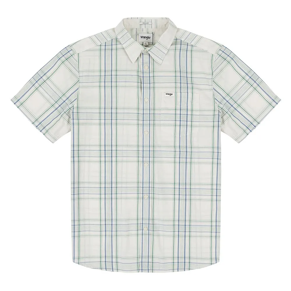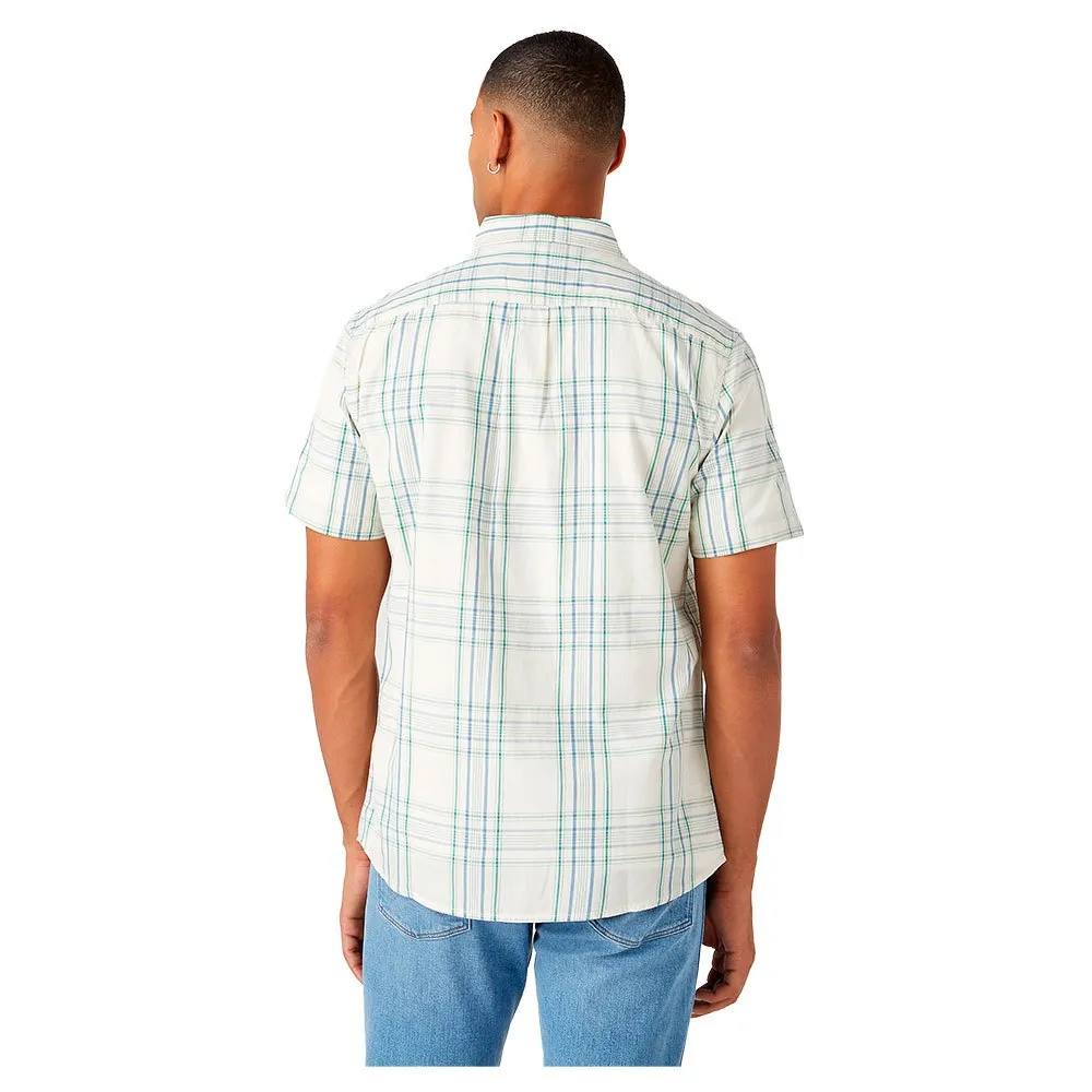 Keep it simple with the classic profile of this short-sleeve one-pocket shirt in a blue and white check, featuring a pointed collar and contrasting buttons.